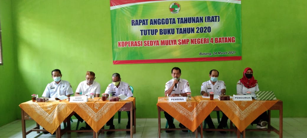 Koperasi Sedya Mulya SMP Negeri 4 Batang yang terletak di Jl. Pemuda No. 160 Pasekaran Batang telah melaksanakan Rapat Anggota Tahunan (RAT) tutup buku tahun 2020. Pada RAT yang diselenggarakan Rabu, 24 Maret 2021, pengurus yang diketuai oleh Albert Rizal, S.Sn. dan bendahara Erna Dewi Palupi, S.E. memberikan laporan pertanggungjawaban kepada anggota yang meliputi laporan bidang organisasi, permodalan, dan usaha. Pada bidang organisasi, pengurus melaporkan jumlah anggota pada tanggal 31 Desember 2019 sebanyak 50 orang dan pada tanggal 31 Desember 2020 berjumlah 49 orang. Perubahan jumlah tersebut terjadi karena di tahun 2020 ada anggota yang keluar sebanyak 4 orang dan masuk 3 orang. Adapun bidang permodalan, dalam laporannya pengurus menyampaikan, permodalan koperasi pada akhir tahun 2020 sebesar Rp. 437.799.330,-. Selanjutnya bidang usaha, kegiatan usaha selama tahun 2020 meliputi, usaha penjualan pinjaman, sisa pinjaman dan jasa tahun 2020.