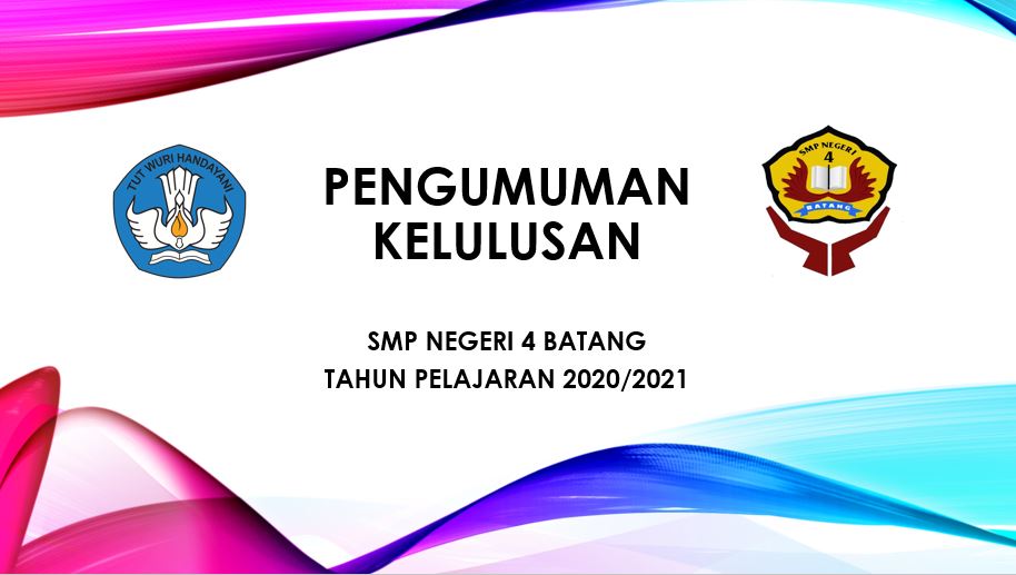 Pengumuman Kelulusan Siswa Kelas IX Tahun Pelajaran 2020/2021 berdasarkan surat Kepala Dinas Pendidikan dan Kebudayaan Kab. Batang Nomor 420/879/2021 Tanggal 24 Mei 2021 Perihal Pemberitahuan Kelulusan Siswa Kelas IX SMP Kab. Batang, dan hasil Rapat Dewan Guru SMP Negeri 4 Batang Tanggal 4 Juni 2021,