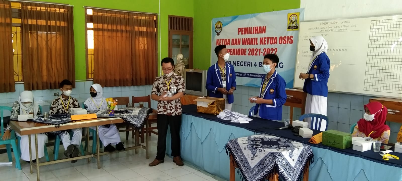 Sesuai dengan program kerja kesiswaan dan OSIS SMP Negeri 4 Batang, selama 2 hari yaitu Rabu dan Kamis, 10-11 November 2021 diadakan kegiatan pemilu / pemilihan ketua dan wakil ketua OSIS tahun 2021 di Ruang Laboratorium IPA SMP Negeri 4 Batang. Sebelumnya telah diadakan seleksi akademik dan tes wawancara untuk calon pengurus OSIS. Dari peserta didik yang mendaftar terpilih 3 calon/kandidat ketua dan wakil ketua. Mereka adalah Nabila Nirmala dan Lintang Ayu (Kandidat 1), Laura Queen dan Satria Hegar (Kandidat 2), Kalindra A. dan Zona Prathistha (Kandidat 3).